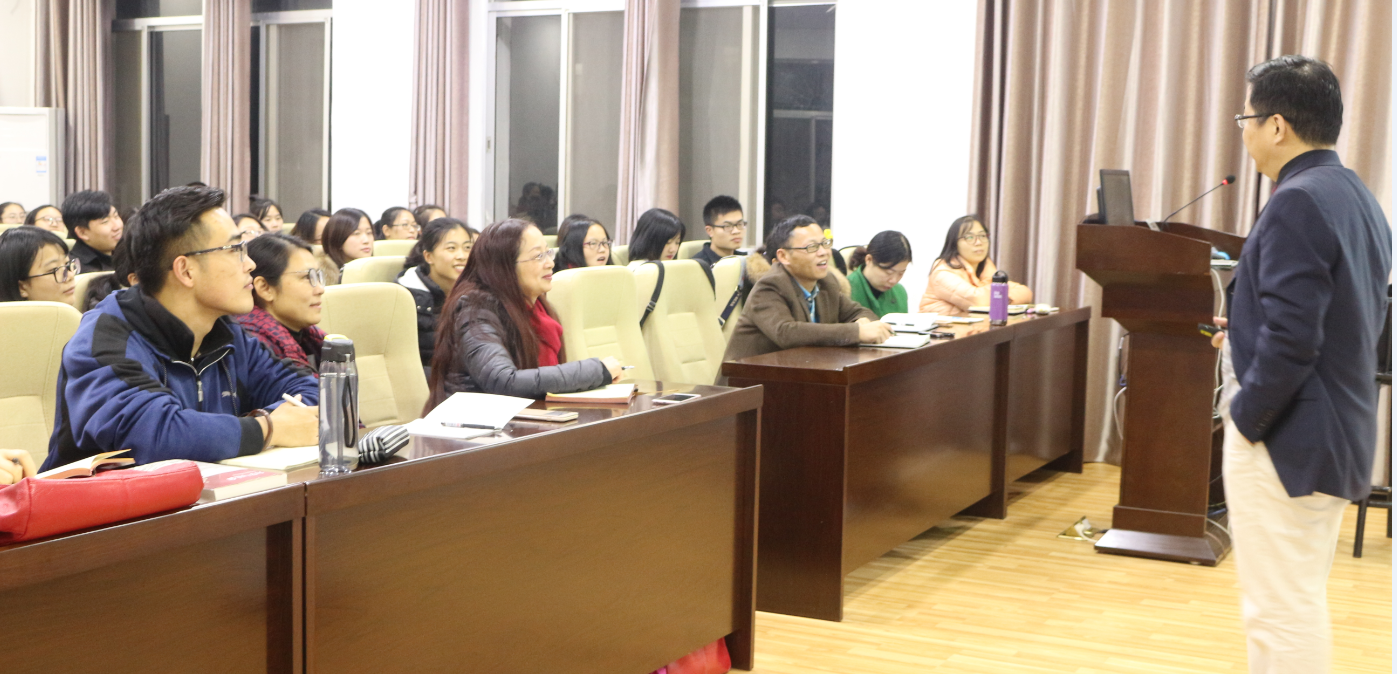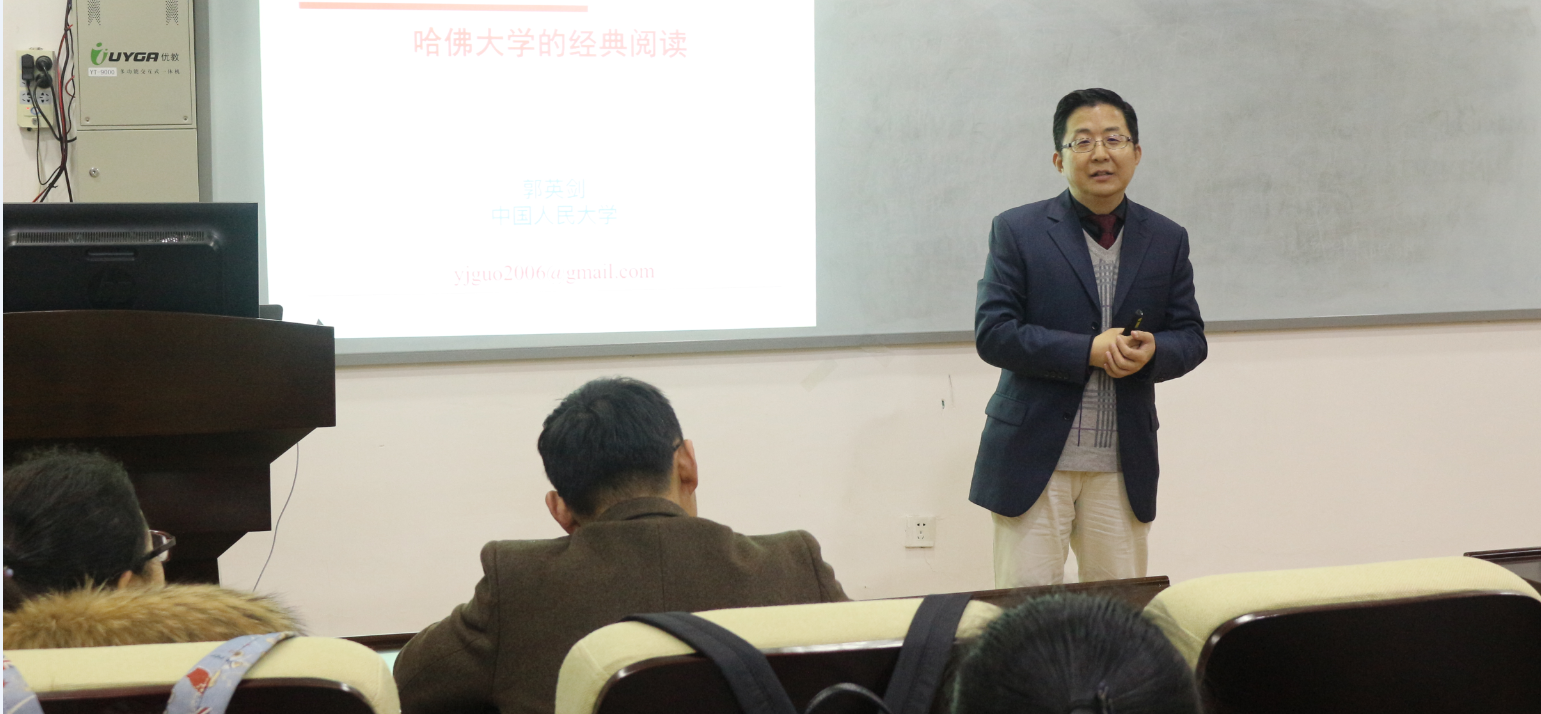 12月13日晚,中国人民大学“杰出学者”特聘教授、中国人民大学yd222云顶线路检测网站博士生导师郭英剑教授应邀在外语楼305学术报告厅作了一场题为《哈佛大学的经典阅读》的学术讲座。讲座由胡慧教授主持,学院部分老师、研究生和本科生参与聆听讲座。