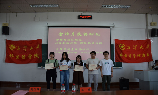 刘源宣布雷锋月获奖班级及志愿服务先进个人,学生会副主席张路聪为获奖班级和个人颁奖并合影留念。2018级英语四班和2020级英语四班获得雷锋月模范班级,2020级英语一班和2020级法语一班获得雷锋月创意服务班级,获得志愿服务先进个人的为赵子怡、周后成、李怡婷、徐铭悦、何佩璇、朱婷婷、周姣吕、万怡、白颜、木孟雨、陈惠妮和贺蓓蓓。