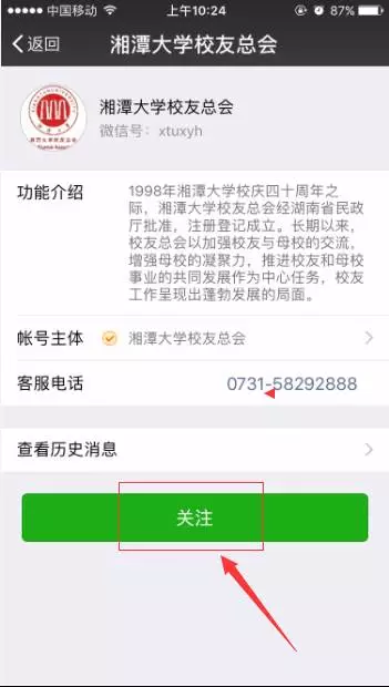 1、关注微信公众号“湘潭大学校友总会”(xtuxyh),进入湘潭大学校友总会主页面。
